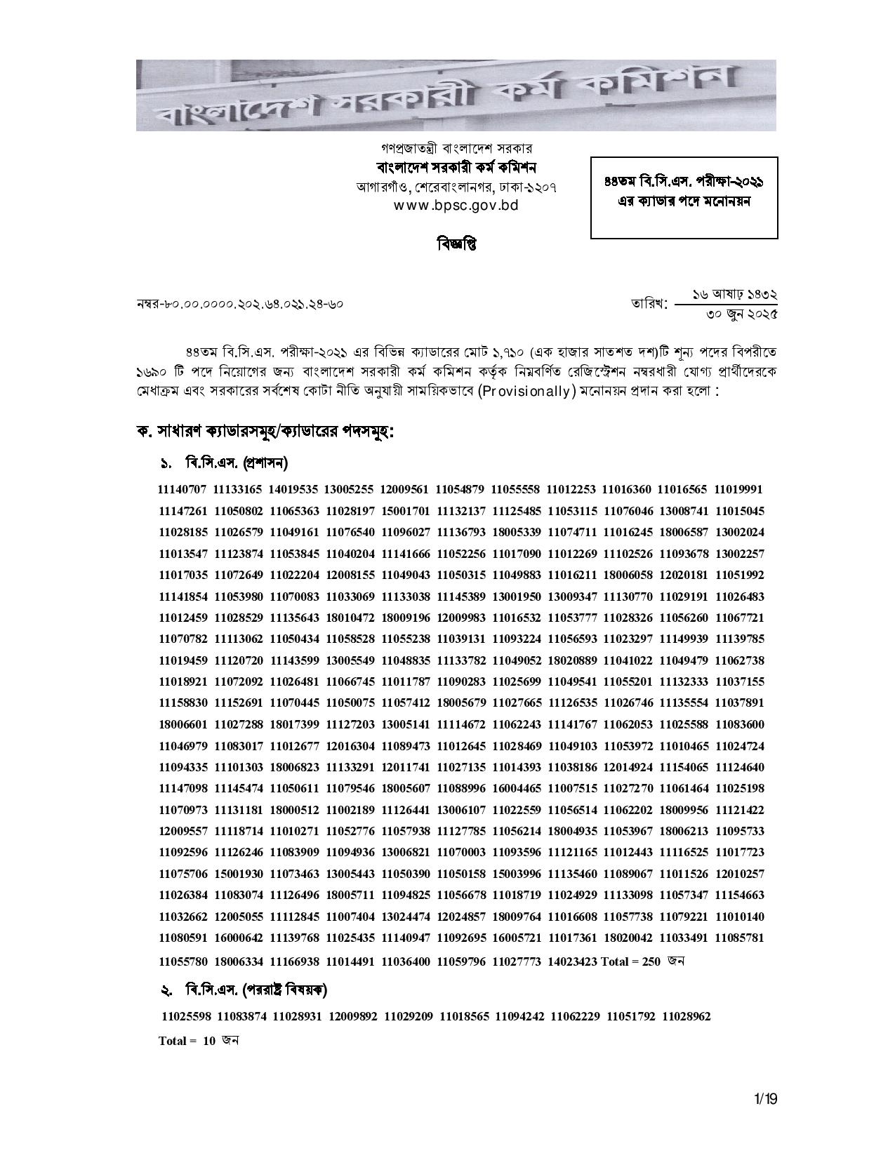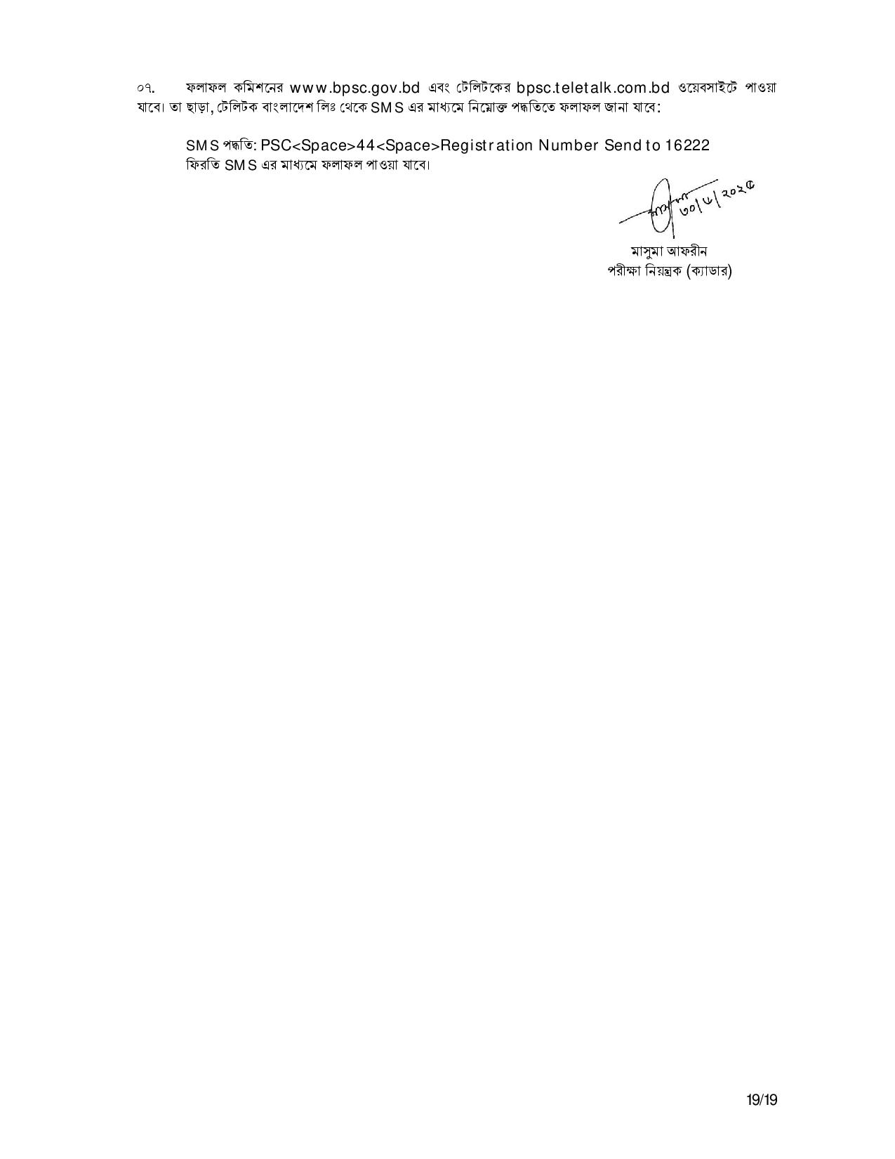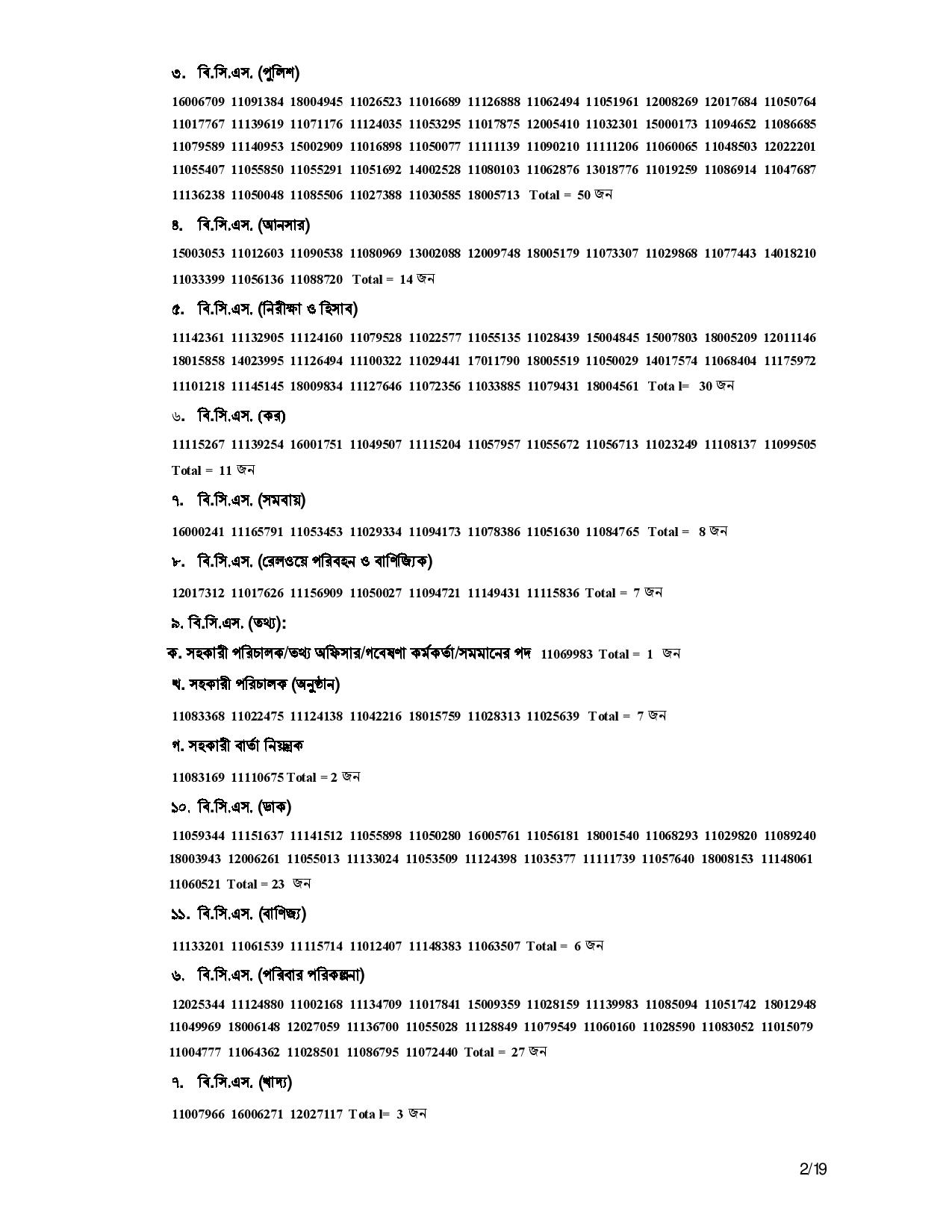 - ক্যাডারভিত্তিক ফলাফল: প্রশাসন, পুলিশ, স্বাস্থ্য, শিক্ষা, আনসার, আয়কর, ডাক, রেলওয়ে, বন, প্রকৌশল, কৃষি, উপসহকারী প্রকৌশলী সহ অন্যান্য