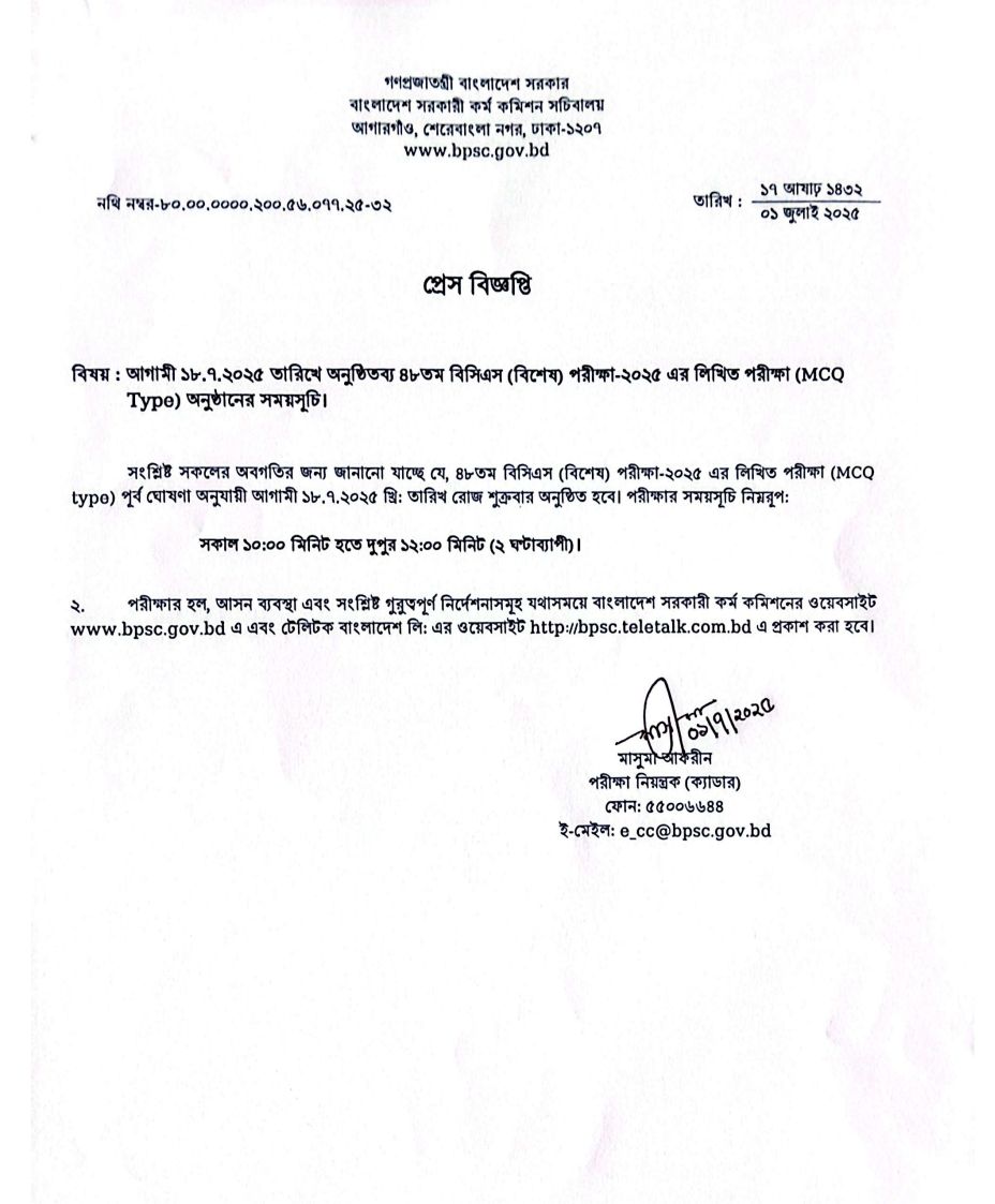 - পরীক্ষার তারিখ নির্ধারিত হয়েছে: ১৮ জুলাই ২০২৫, শুক্রবার