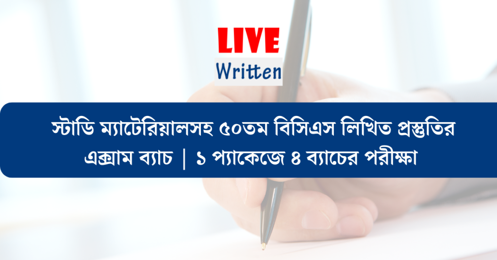 ৫০তম বিসিএস লিখিত পরীক্ষা সামনে রেখে Live Written অ্যাপে শুরু হয়েছে “স্টাডি ম্যাটেরিয়ালসহ ৫০তম বিসিএস লিখিত প্রস্তুতির এক্সাম ব্যাচ” — যেখানে এক প্যাকেজেই চলমান একাধিক ব্যাচের সকল পরীক্ষা দেওয়ার সুযোগ মিলছে।