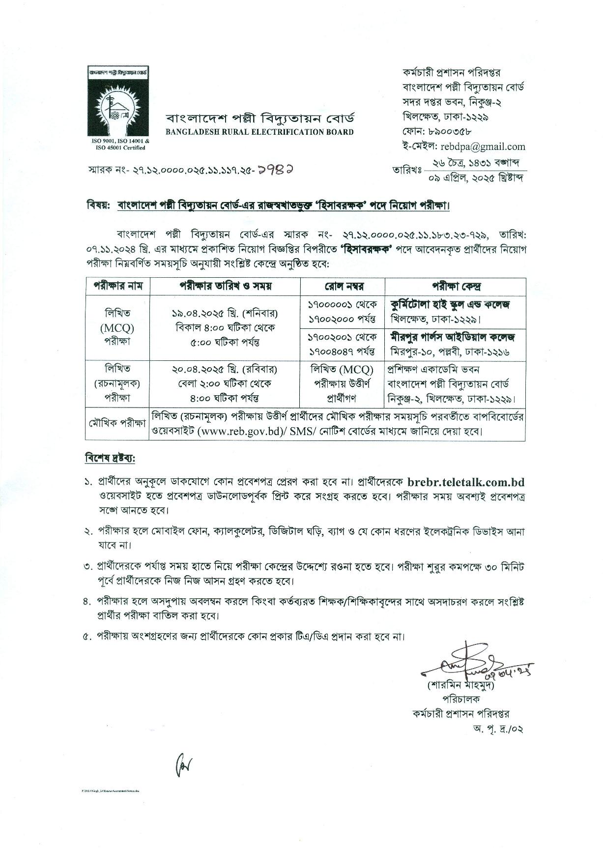 পল্লী বিদ্যুতায়ন বোর্ড হিসাবরক্ষক পদে নিয়োগ পরীক্ষার সময়সূচি