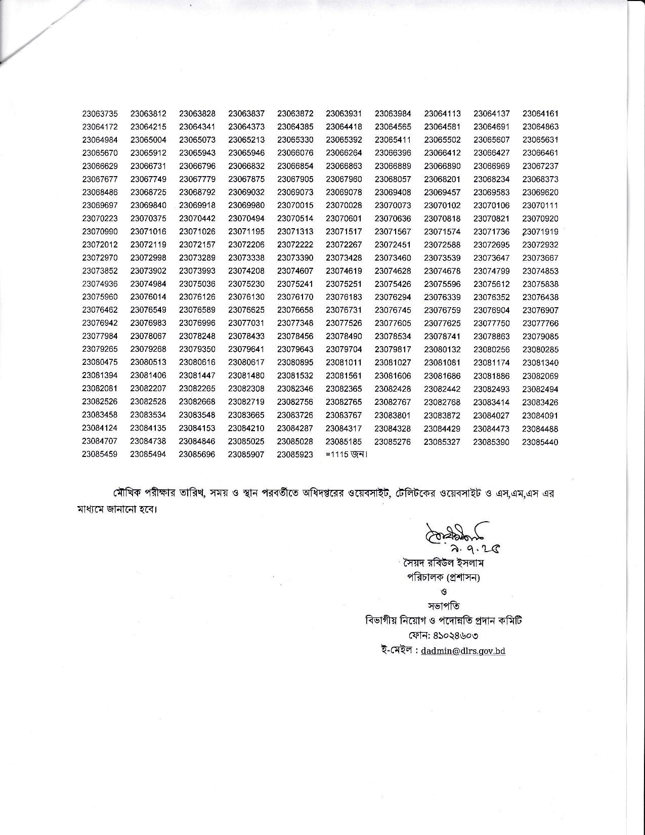 প্রিয় চাকরির প্রত্যাশীগণ, ভূমি রেকর্ড ও জরিপ অধিদপ্তরের ব্যবহারিক পরীক্ষার ফলাফল প্রকাশিত হয়েছে। বিজ্ঞপ্তি অনুসারে, বাংলাদেশের ভূমি রেকর্ড ও জরিপ অধিদপ্তরের আওতাধীন জোনাল ও উপজেলা সেটেলমেন্ট অফিসে রাজস্ব খাতভুক্ত “কপিষ্ট কাম বেঞ্চ সহকারী” পদে নিয়োগের লক্ষ্যে অনুষ্ঠিত ব্যবহারিক পরীক্ষায় ১১১৫ জন প্রার্থী উত্তীর্ণ হয়েছেন। উত্তীর্ণ প্রার্থীদের লিখিত/সাক্ষাৎকার পরীক্ষার সময়সূচি ও নির্দেশনা পরবর্তীতে আলাদাভাবে জানানো হবে। উত্তীর্ণ প্রার্থীদের অভিনন্দন এবং পরবর্তী ধাপের জন্য শুভ কামনা।