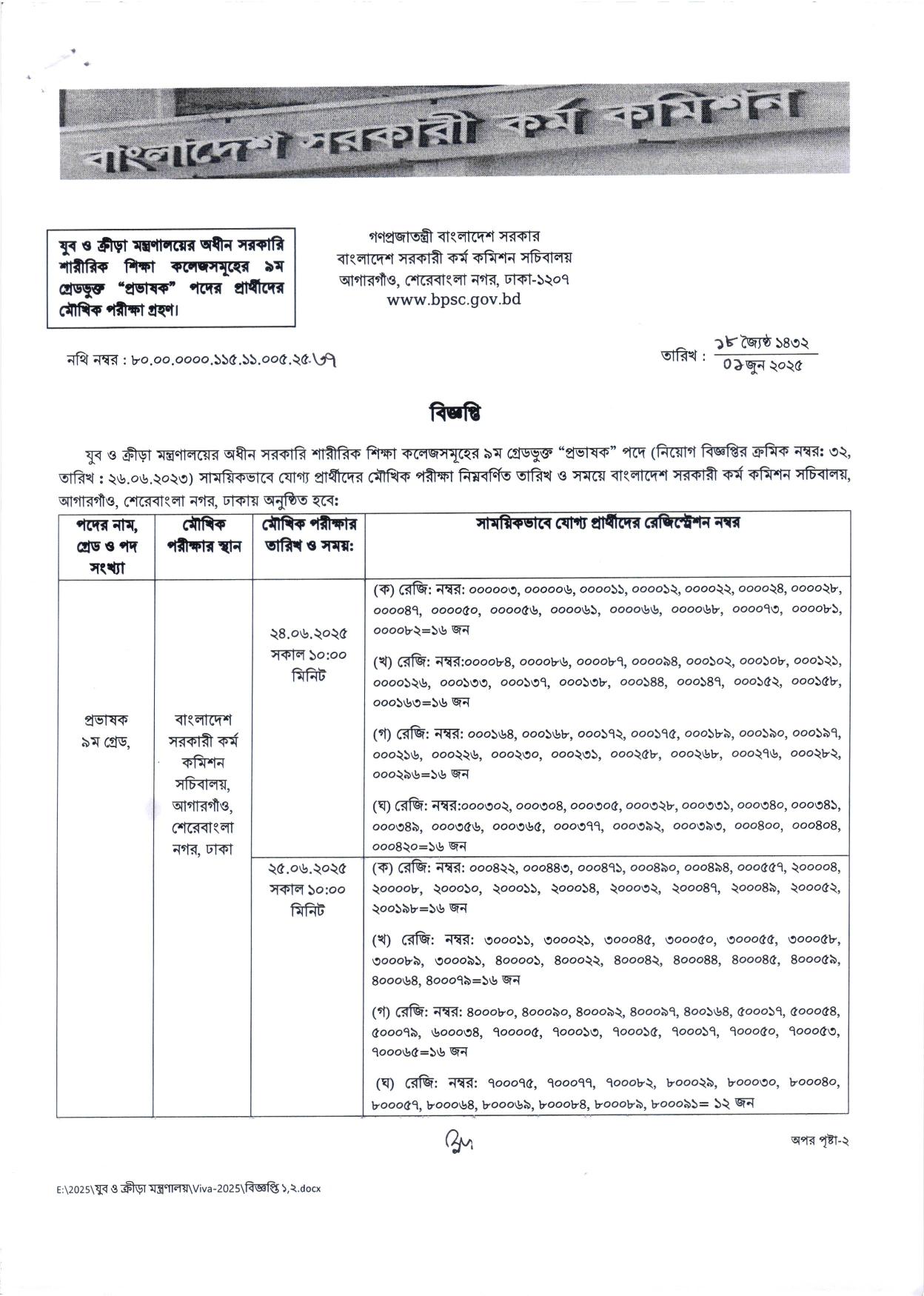 প্রিয় চাকরি প্রার্থীগণ, বাংলাদেশ সরকারী কর্ম কমিশন (BPSC)-এর এক বিজ্ঞপ্তিতে জানানো হয়েছে যে, সরকারি শারীরিক শিক্ষা কলেজের প্রভাষক পদের মৌখিক পরীক্ষার সময়সূচি পরীক্ষার সময়সূচি প্রকাশিত হয়েছে।