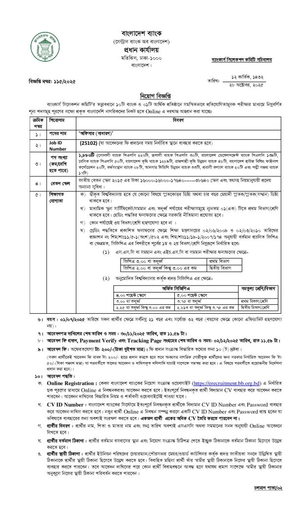 প্রিয় চাকরিপ্রত্যাশীগণ, আপনাদের জন্য সুখবর! ১০টি ব্যাংক ও ১টি আর্থিক প্রতিষ্ঠানে অফিসার (সাধারণ) পদে নিয়োগ বিজ্ঞপ্তি ২০২৫ প্রকাশিত হয়েছে। ২৮ অক্টোবর, ২০২৫ তারিখে এ নিয়োগ বিজ্ঞপ্তিটি প্রকাশ করে বাংলাদেশ ব্যাংক কর্তৃপক্ষ।