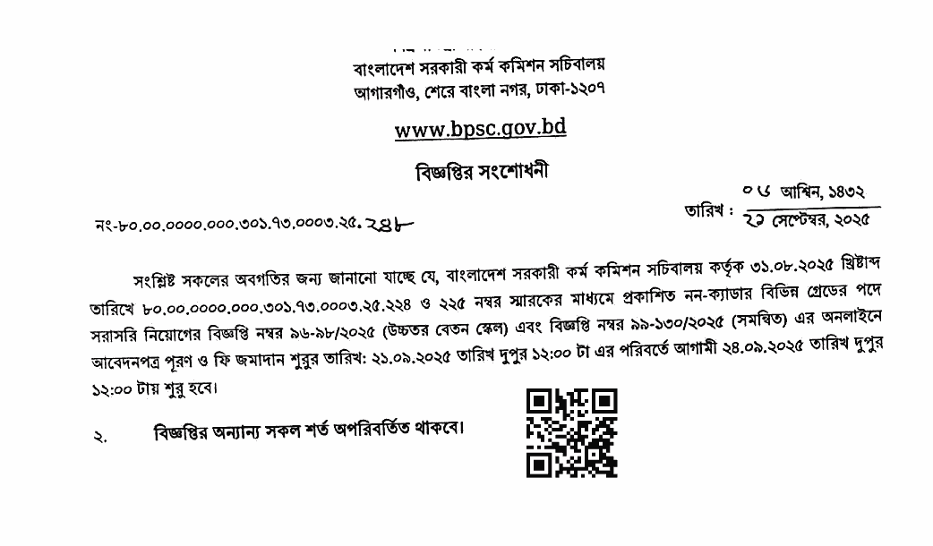 বিভিন্ন পদের নন ক্যাডার নিয়োগ পরীক্ষার আবেদন শুরুর তারিখ পরিবর্তন সংক্রান্ত বিজ্ঞপ্তি
